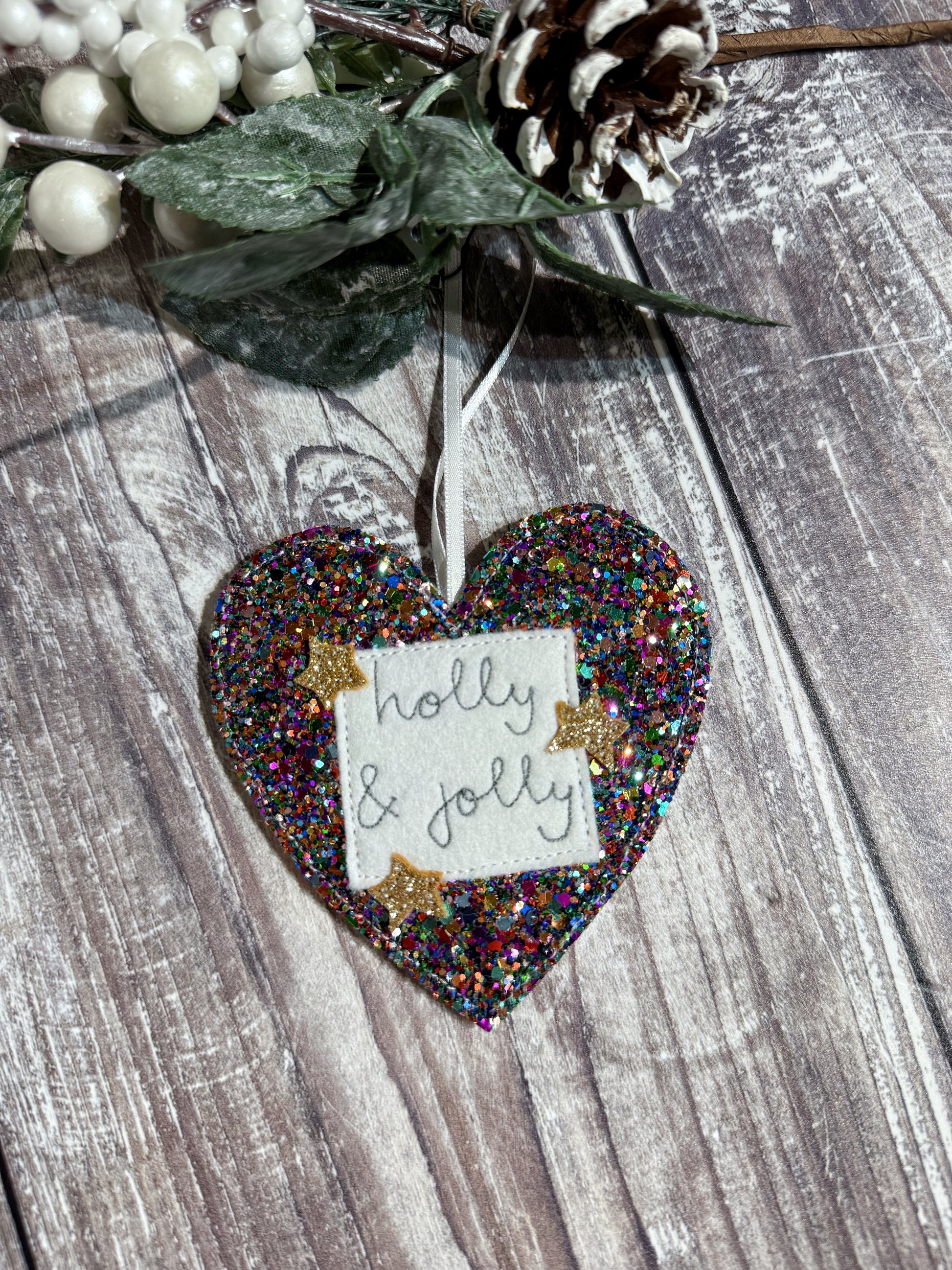 Our glitter heart decorations are made from super sparkly premium glitter felt and feature a message written using the sewing technique, free motion embroidery.